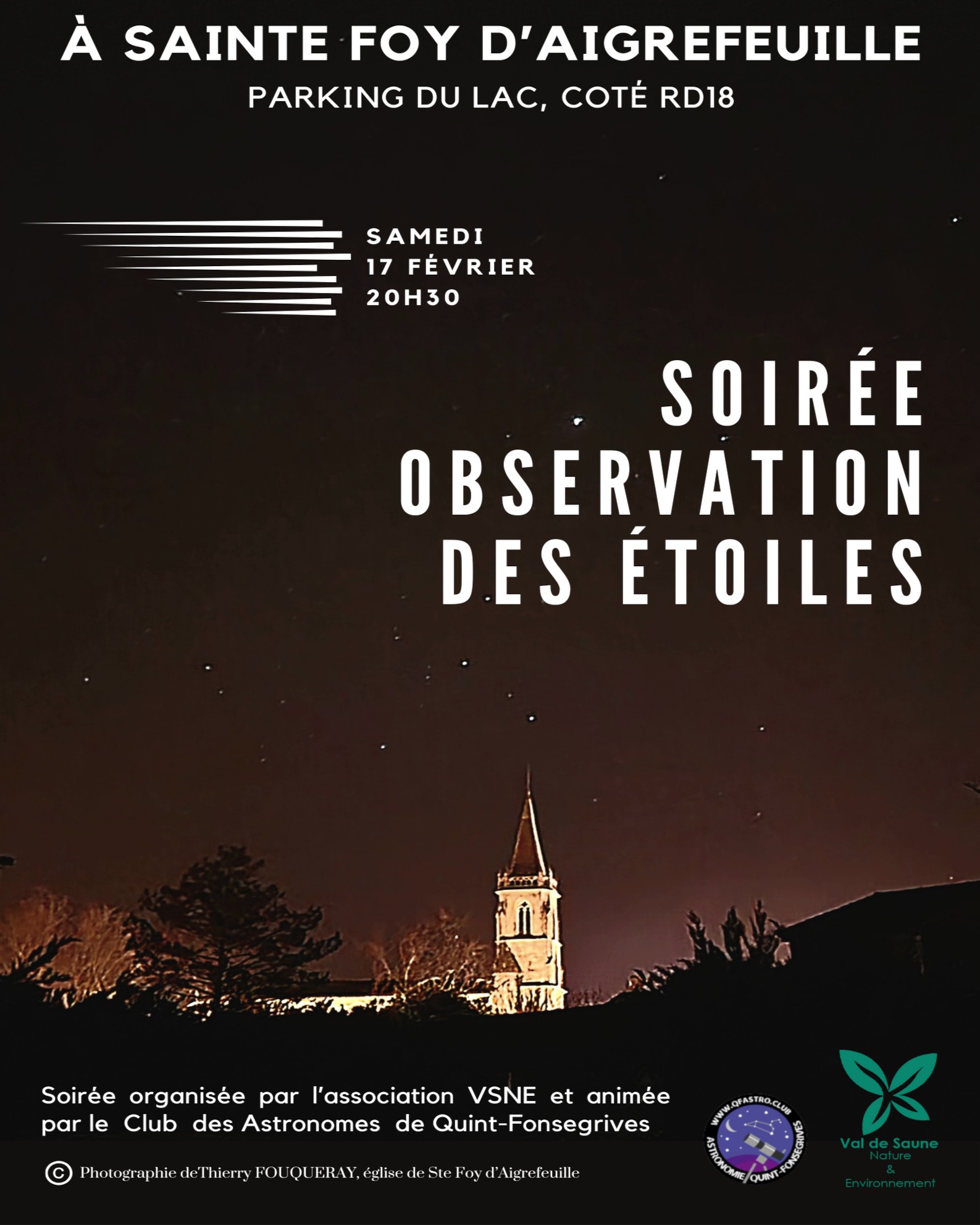 Pour le club astro, rendez-vous à partir de 19h30 au Lac du Val de Saune à Sainte-Foy-d'Aigrefeuille (latitude 43.5478, longitude 1.6055), à environ 10 mn de Quint-Fonsegrives en voiture. Parking Nord, en arrivant par la RD18.