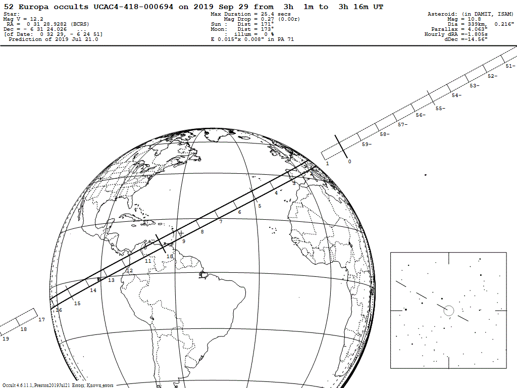 En fin de nuit (vers 5h TL) a eu lieu occultation d'étoile par Europa (il ne s'agit pas ici du satellite de Jupiter mais d'un astéroïde de la ceinture principale).