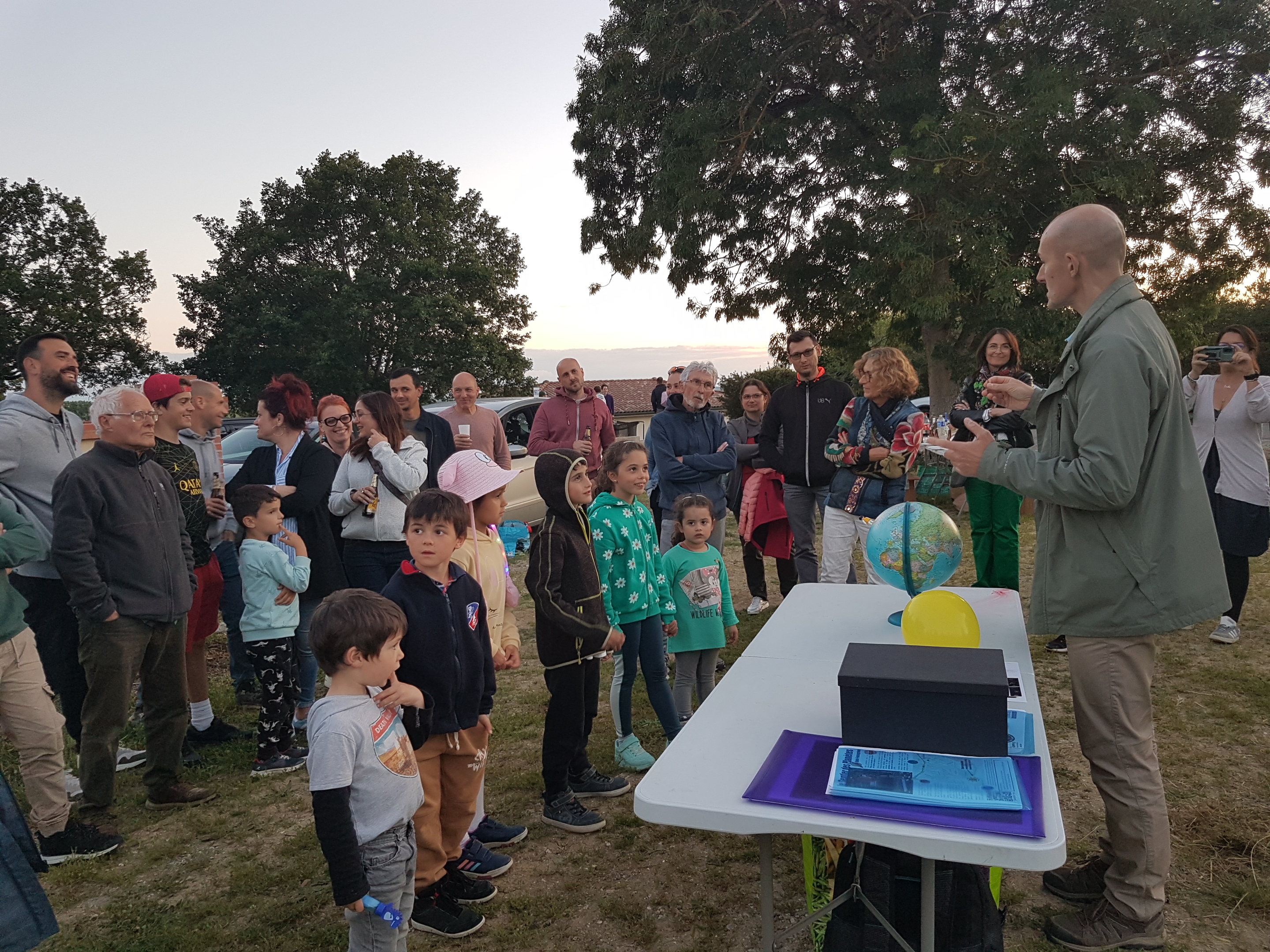 Pendant que la nuit tombait, animation de Frédéric du type “Comprendre la voûte céleste”. Beaucoup de questions (notamment des enfants, donc certains avaient une culture impressionnante).
